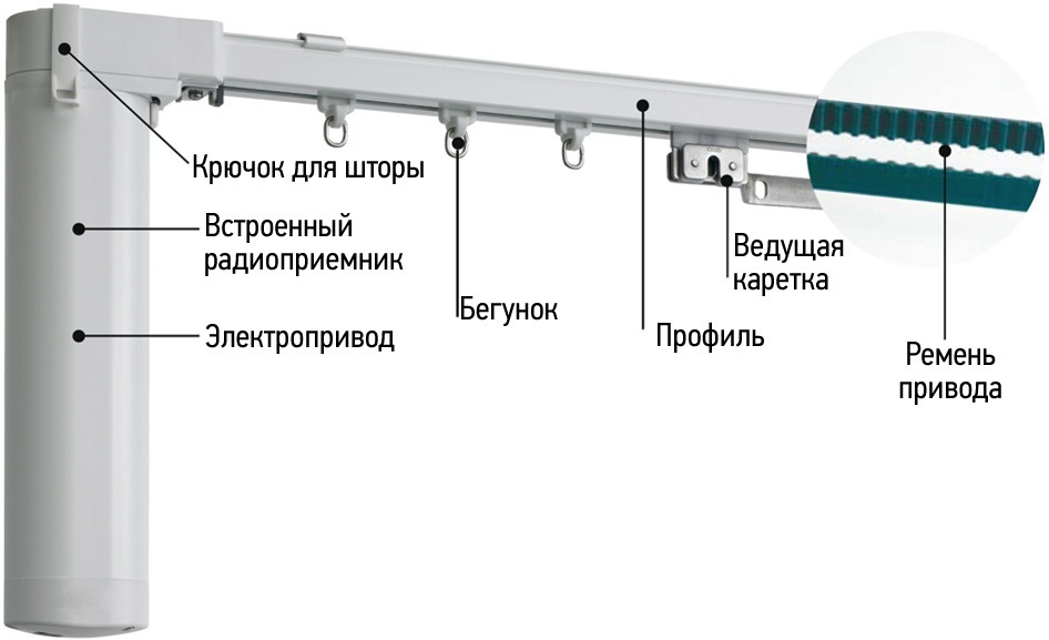 В зависимости от длины штор, выбирают мощность электропривода. Максимальная длина системы перемещения штор достигает 12 м.